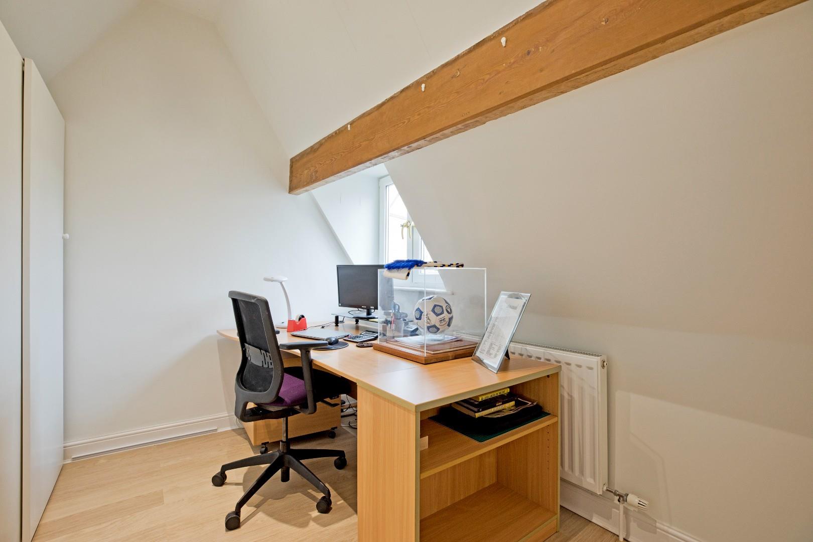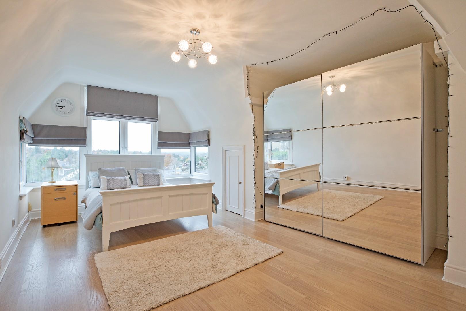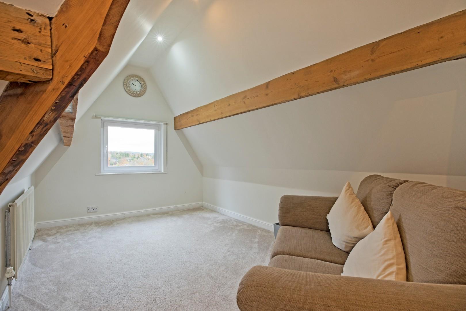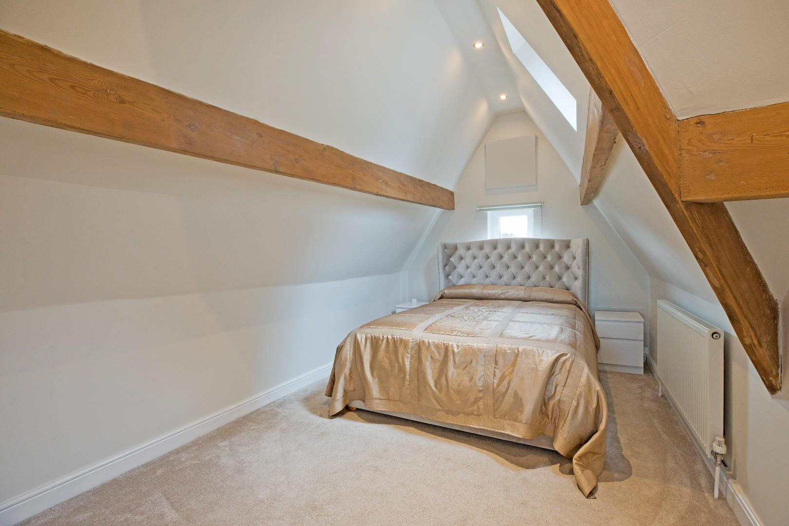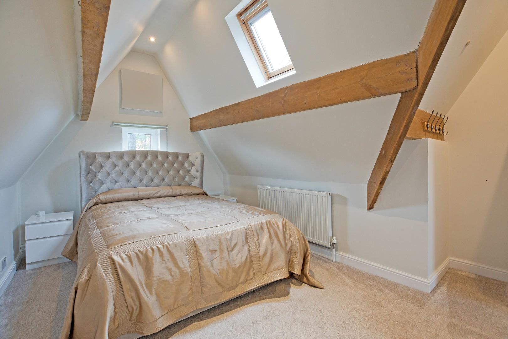 A great-sized, double bedroom with space for a living area, ideally suited to a teenager. Dual aspect windows, the larger one affording delightful far reaching views. Exposed beams lend a characterful feel. Two radiators, downlighting and carpeted flooring.