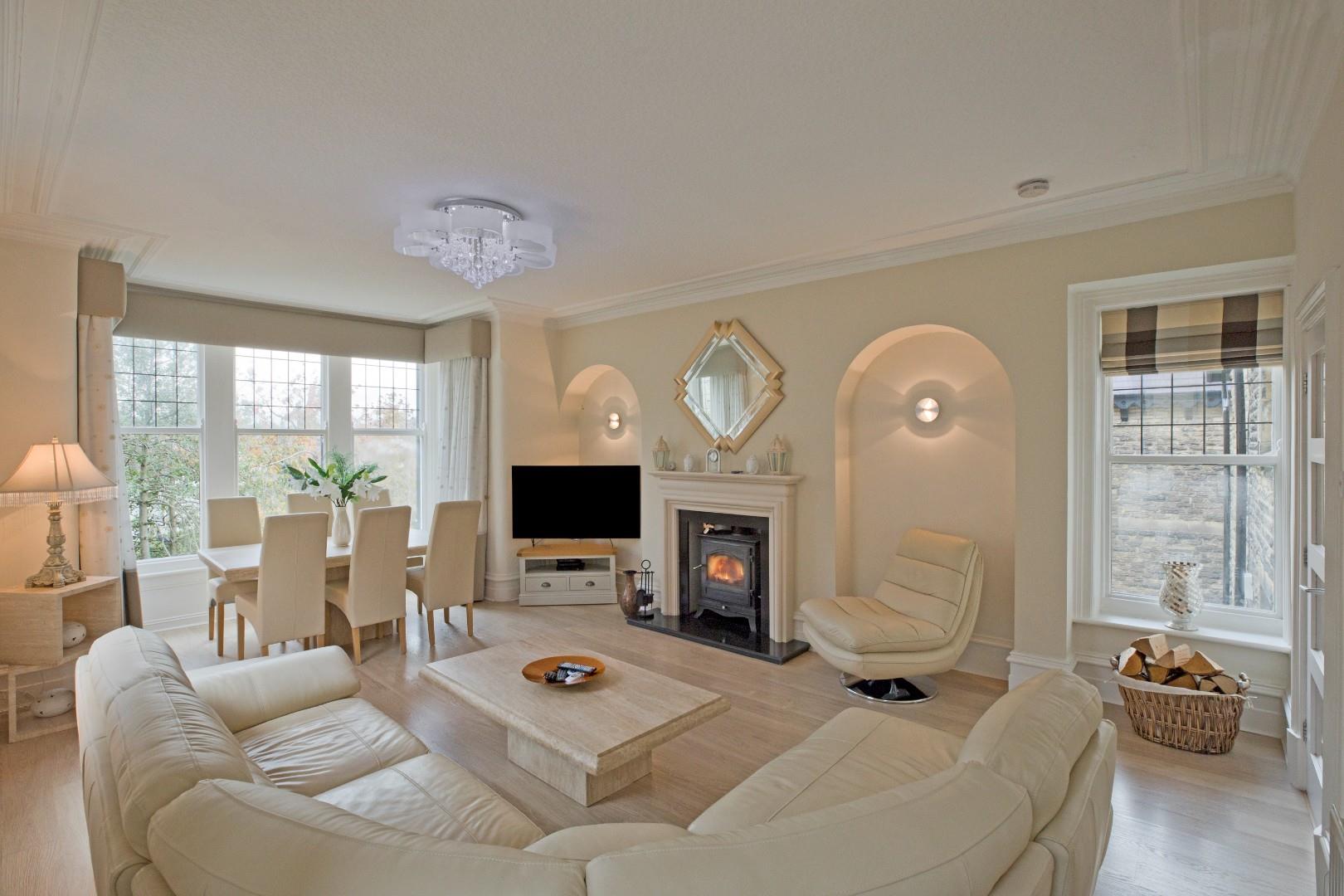 Steps lead down from the hall to a fabulous lounge of superb proportions. This well-proportioned room has an air of elegance and grandeur. Deep skirtings, cornicing and two arched alcoves continue the characterful feel. A large bay window affords breathtaking views across Ilkley towards Middleton. There are two south facing windows including one bay and a fourth window, which also affords stunning views towards Middleton. A fireplace with elegant, stone fire surround with granite hearth houses a cast iron log burning stove. Room for a sofa, armchairs and a family dining table. Laminate flooring, TV point and two radiators.
