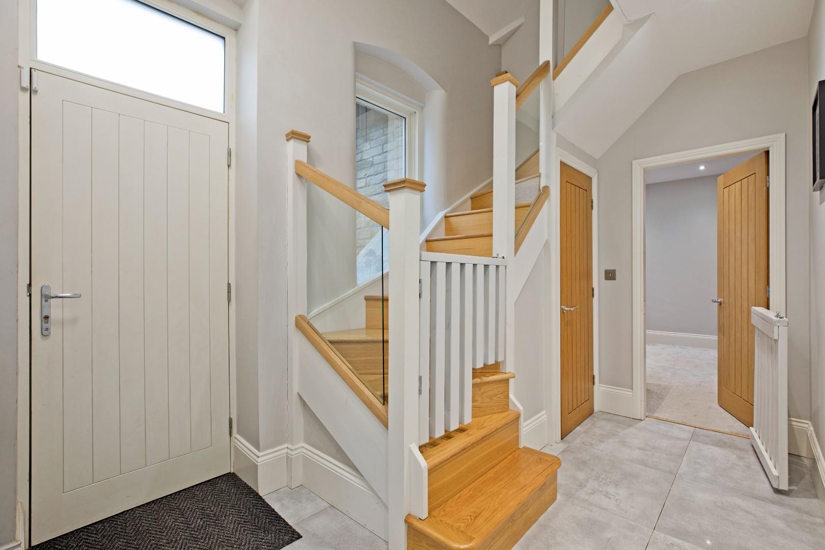 A solid timber entrance door with transom light opens into a spacious and welcoming entrance hall with beautiful, large floor tiles with underfloor heating. Oak panelled doors open into a good sized room to the front of the property, currently arranged as a playroom, with en suite bathroom and dressing room, a stunning living dining kitchen and most useful, understairs storage cupboard. A solid timber return staircase with glass and oak balustrading leads to the first floor of the property.