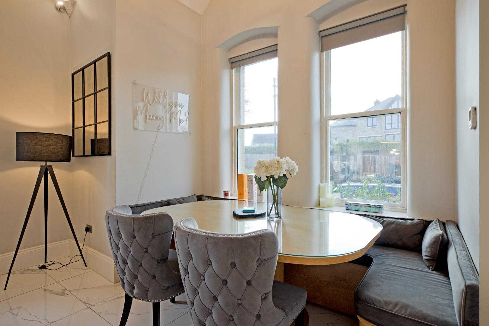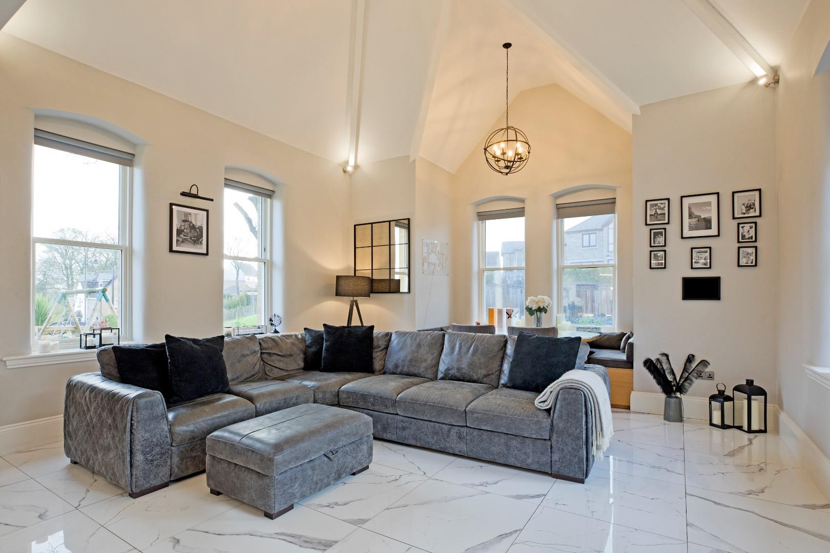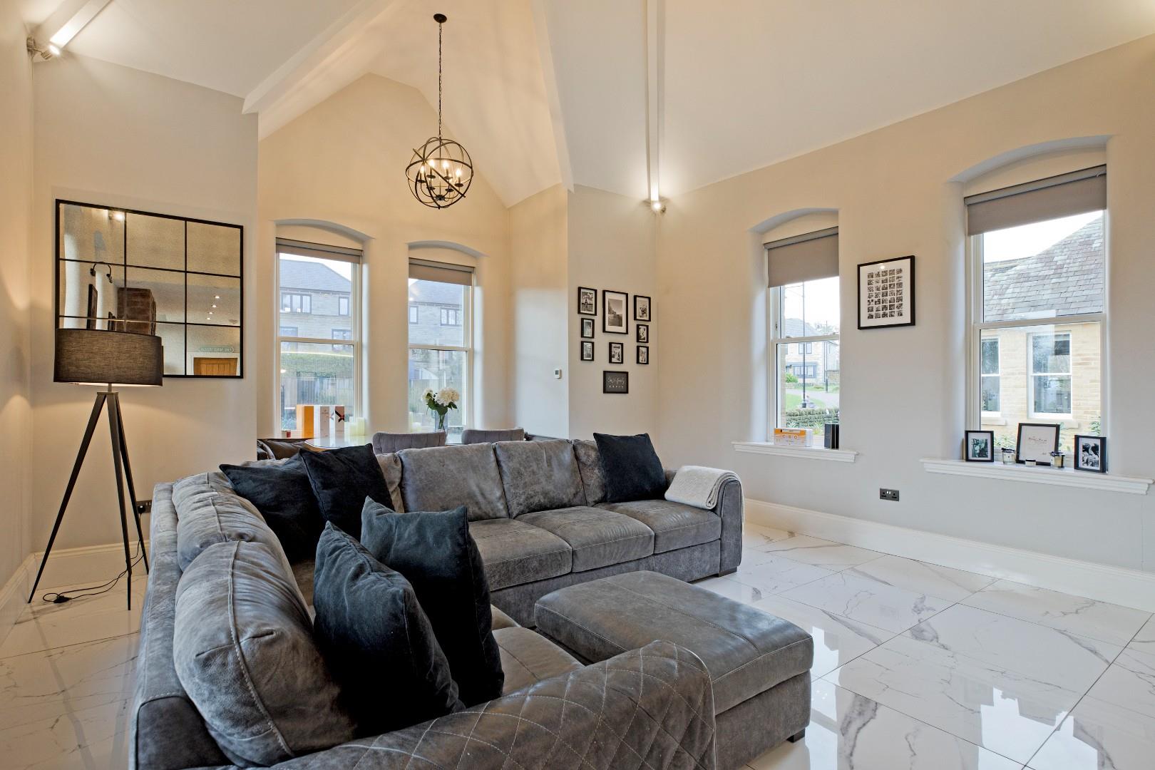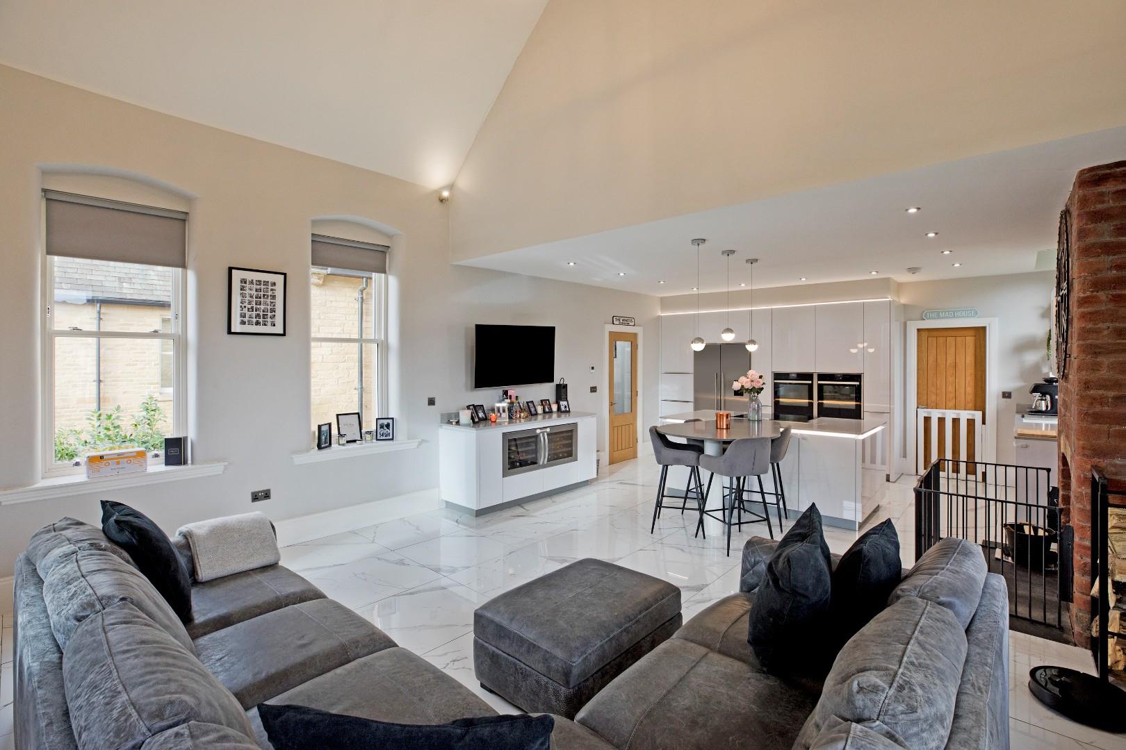 Wow! An impressive, generously proportioned living dining kitchen with beautiful, high gloss cabinetry with Quartz worksurfaces and upstands incorporating a handy Quartz table with seating for five people and retractable, pendant lighting. There is a full range of integrated appliances including two, Neff electric ovens with warming plates, dishwasher, induction hob with recessed extractor, wine fridge and space and plumbing for an American style fridge freezer. Inset sink with chrome mixer tap beneath a window enjoying a direct view across to the Chevin. Recessed spotlights, marble floor tiling throughout with underfloor heating. The living area has ample room for comfortable furniture including a fitted bench seating area in the bay window to the front elevation. Six, tall, sash windows allow ample natural light and tall ceilings add to the feeling of space. A log burning stove sits on a slate hearth in a chimney breast with attractive, exposed brickwork. This is the real hub of the home, a wonderful entertaining space.