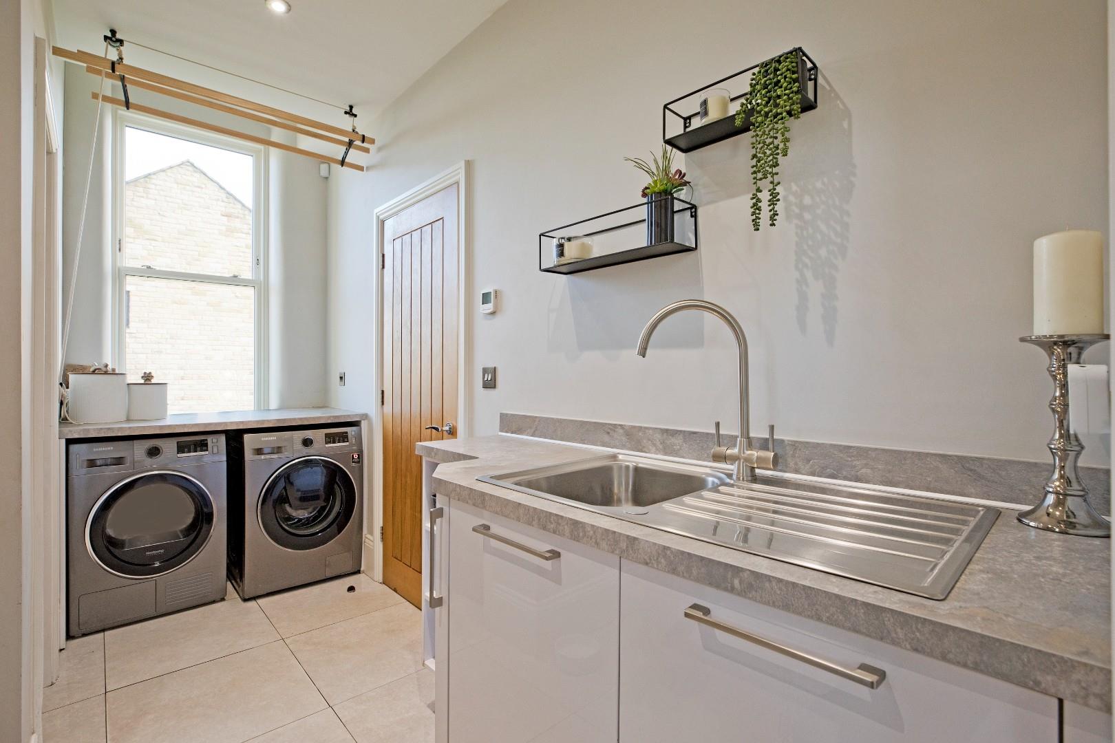 A good sized utility room with high gloss cabinetry with stainless steel sink and drainer with chrome mixer tap set in a stone effect worksurface. Space and plumbing for a washing machine and tumble dryer. Tall sash windows allow ample light, large floor tiles with underfloor heating. Oak panelled doors open into a laundry room housing the gas central heating boiler, and a second door opens into a large W.C/ Cloakroom. A timber door with obscure glazed panel leads outside to the rear. Recessed spotlights.