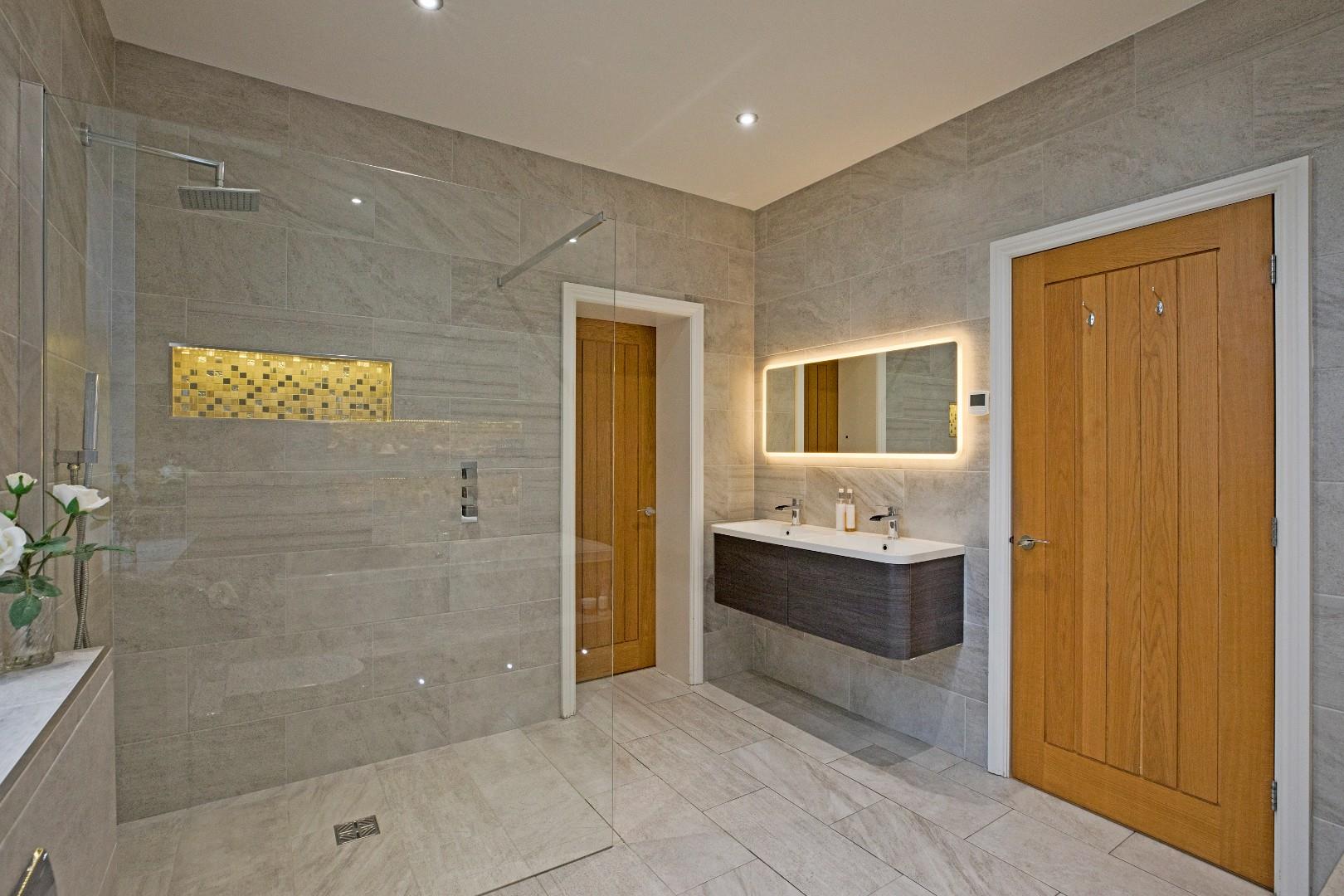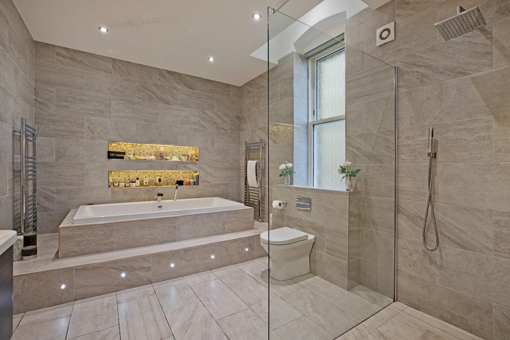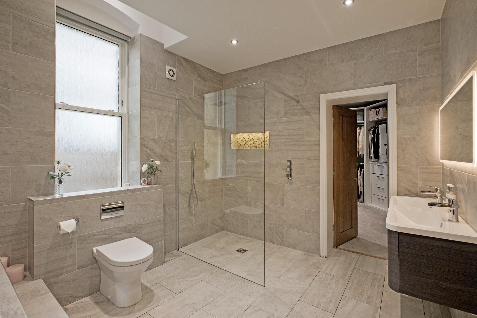 A large, beautifully presented, four-piece, ensuite bathroom with low-level W.C. with concealed cistern, two handbasins with chrome, waterfall mixer tap set in vanity drawers with LED mirror over and deep-fill bath with central, chrome, waterfall tap and shower attachment set in a tiled surround. Large, walk-in shower cubicle with thermostatic, drench shower plus additional shower attachment, recessed shelf and beautiful, stone effect wall tiling and floor tiling with underfloor heating. Recessed spotlights, extractor, tall, obscure, double glazed sash window to rear. Two, chrome, ladder style, heated towel rails. Door into: