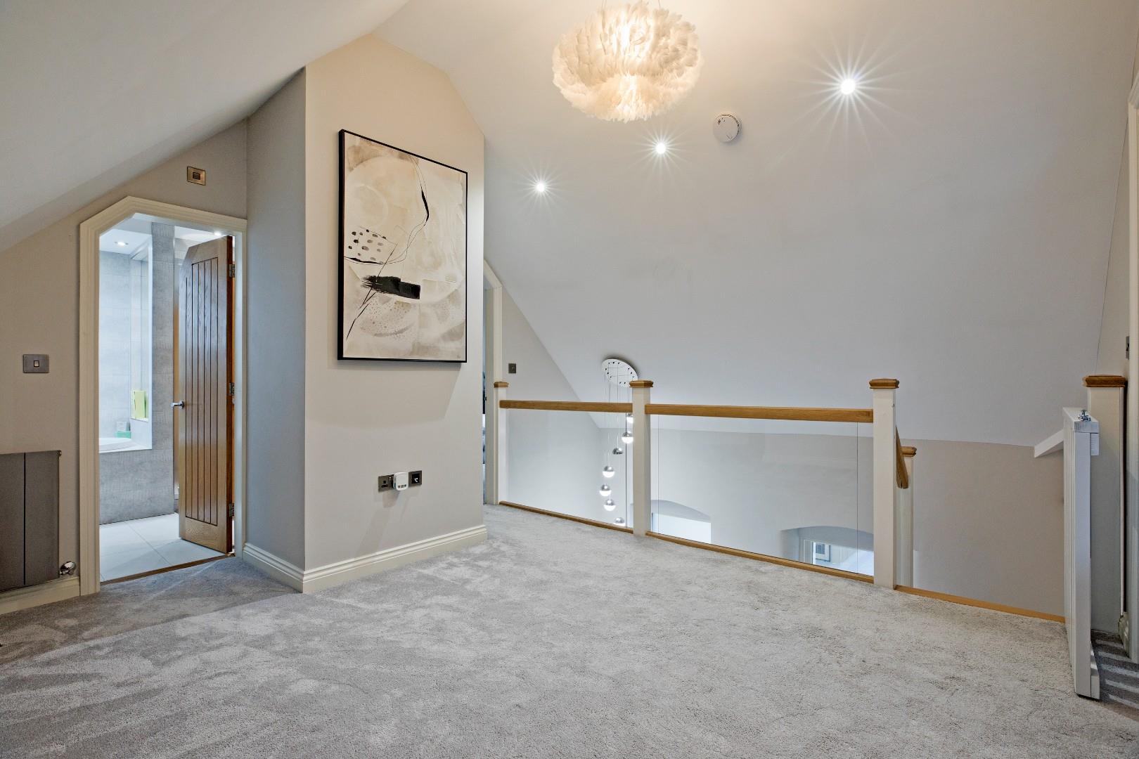 A solid timber staircase with attractive glass and wooden balustrading leads up to the most spacious, first floor landing area. Carpeted flooring, high ceiling, recessed spotlights. Contemporary style radiator, doors open into a Jack and Jill bathroom and two, generously proportioned, double bedrooms.