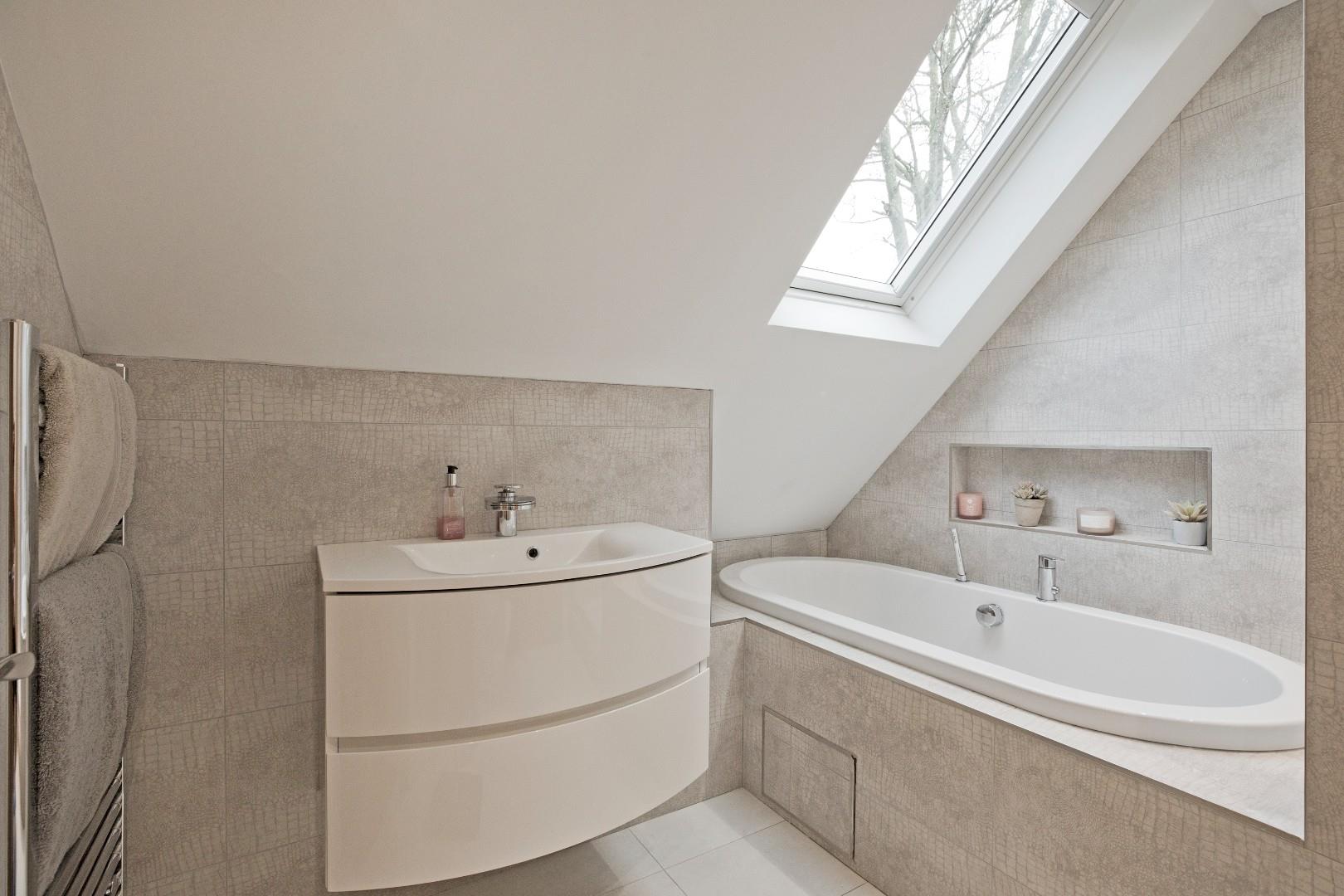 Beautifully presented with low-level W.C., large handbasin set in deep vanity drawers with circular, chrome, mixer tap and deep-fill bath in a fully tiled surround with central, chrome mixer tap and shower attachment. Separate shower cubicle with thermostatic drench shower plus additional shower attachment, large, glazed door and attractive wall tiling. Complementary floor tiles with underfloor heating, wall mounted mirror, recessed spotlights, extractor. Chrome, ladder style, heated towel rail, Velux.