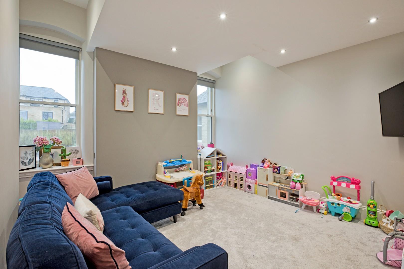 A good sized room with carpeted flooring with underfloor heating, two, tall, double glazed windows to the front elevation and recessed spotlights. Currently arranged as a snug/playroom this would work equally well as a lounge or spacious double bedroom with an oak panelled door giving access to a large en suite and dressing room.