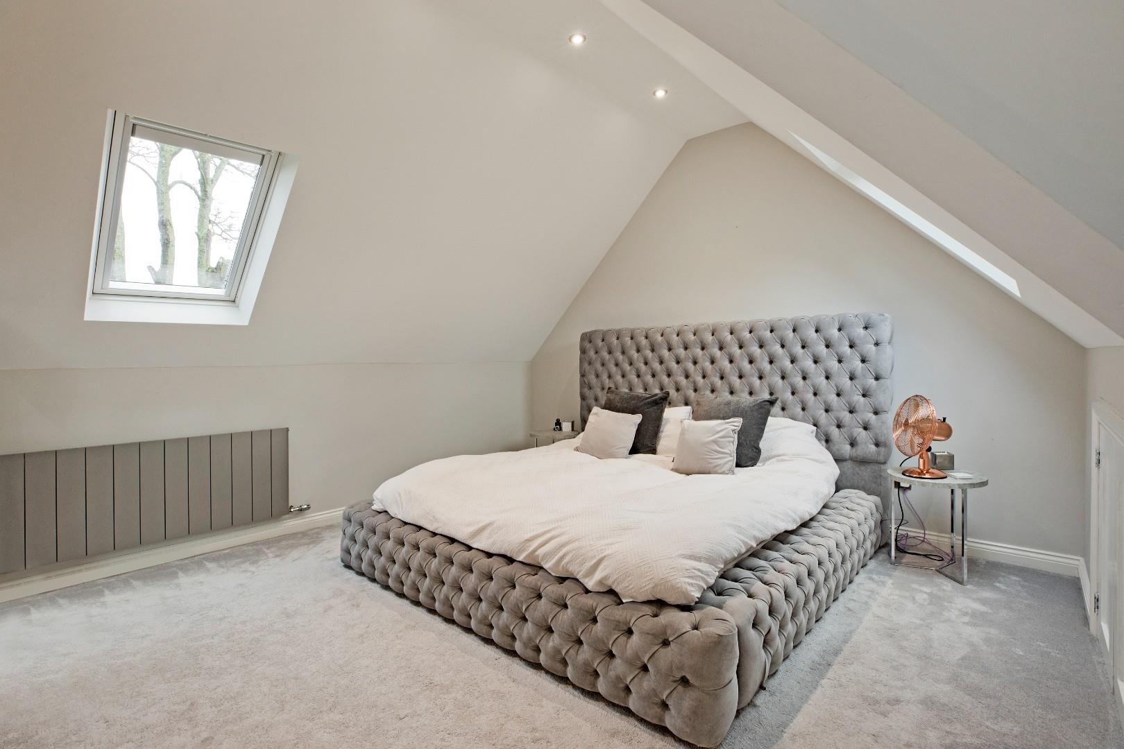 A large double bedroom with carpeted flooring, high ceiling, two Veluxes and contemporary style radiator. Recessed spotlights, under eaves storage, oak panelled doors opening into the Jack and Jill bathroom and walk-in wardrobe.