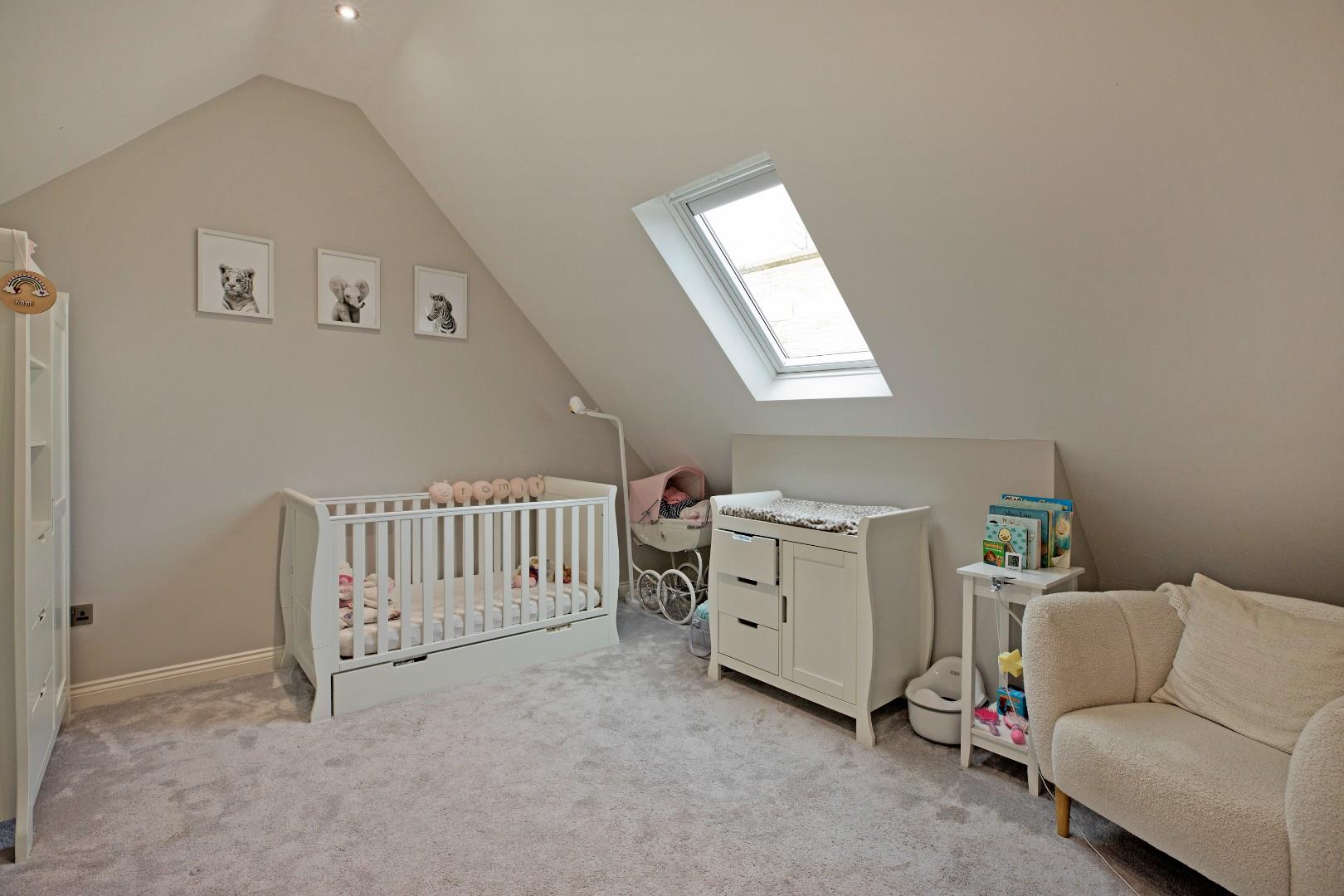 A good sized double bedroom with carpeted flooring, radiator and Velux enjoying lovely views to the rear across open fields. High ceiling, recessed spotlights, door into.
