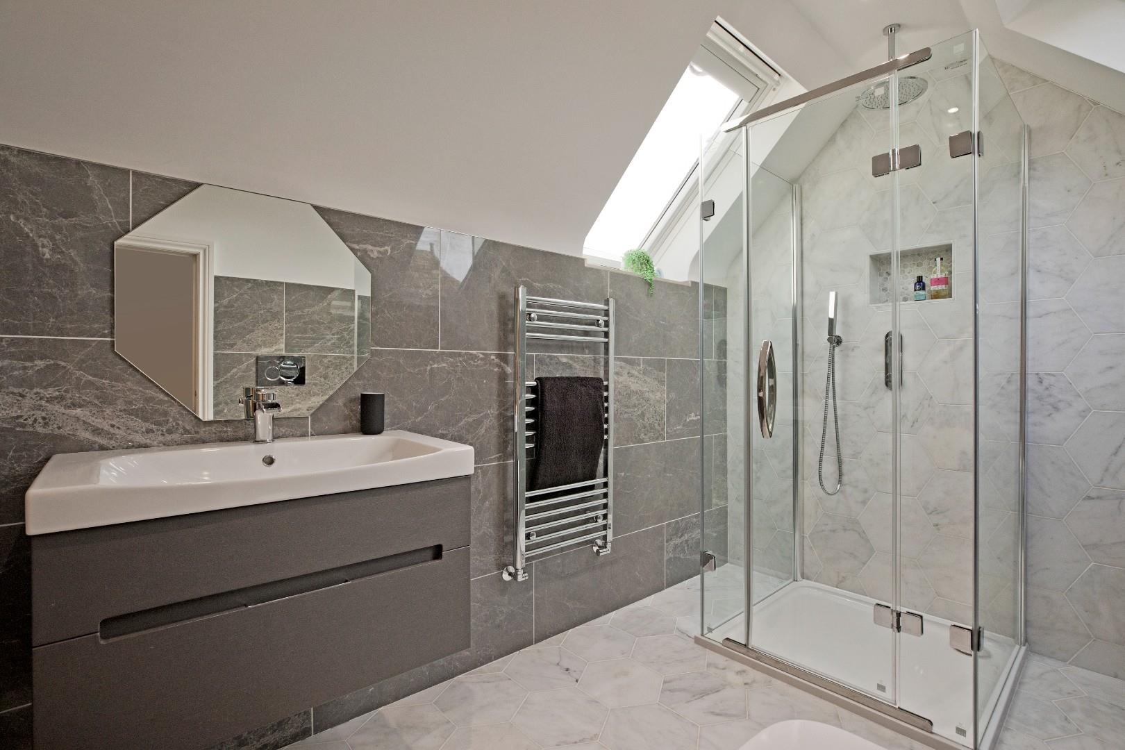 Immaculately presented with low-level W.C. with concealed cistern, large handbasin with chrome, waterfall mixer tap set in vanity drawers with hexagonal wall mirror over and separate shower cubicle with thermostatic drench shower plus additional shower attachment, recessed shelf and beautiful, hexagonal wall and floor tiling. Two Veluxes allow natural light, recessed spotlights, extractor, useful storage cupboard.