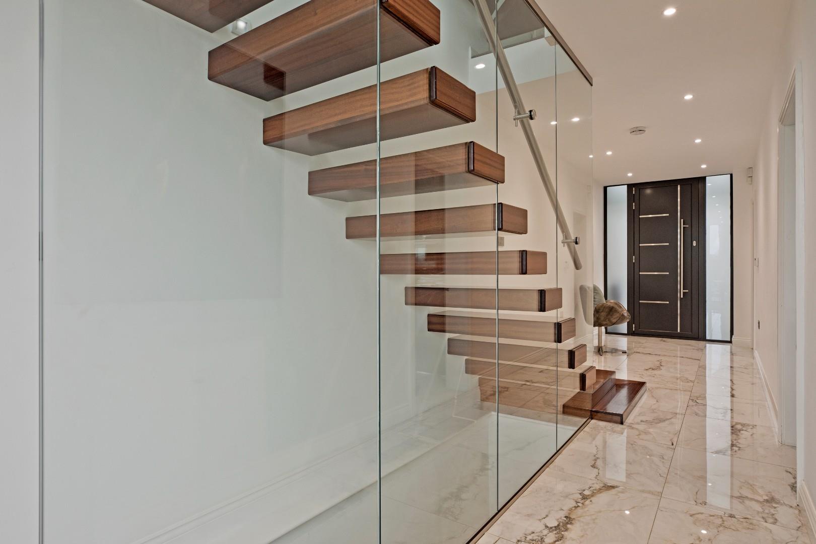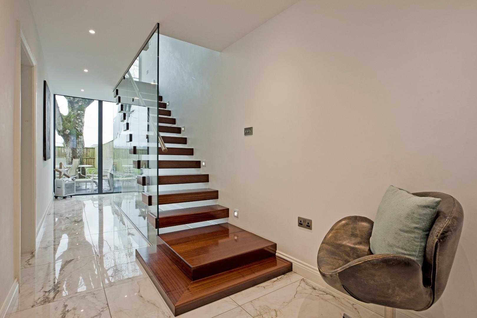 A tall, smart, solid entrance door with obscure glazed panes opens into a light-filled, spacious reception hall. High-quality marble floor tiles with underfloor heating, solid wood staircase with beautiful glass balustrading leading to the first floor. A carpeted staircase leads to the lower ground floor of the property. Tall, double glazed windows at the end of the hallway enjoy a fantastic view of open countryside and over the garden. Doors open into the living dining kitchen and most useful boot room with cloakroom/W.C.