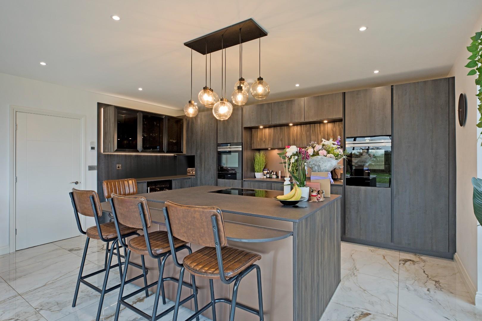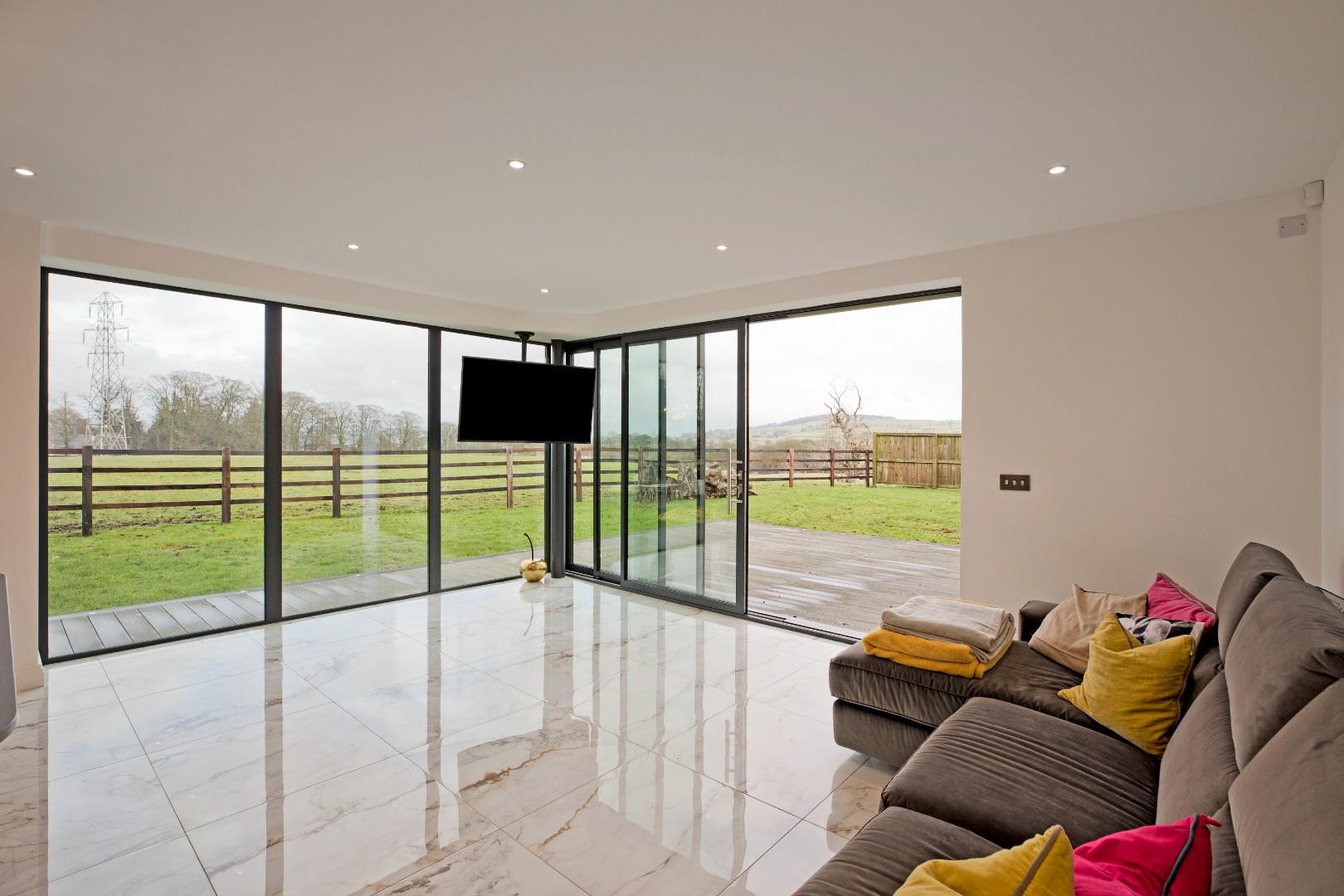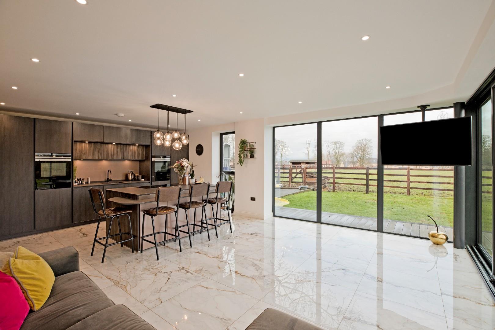 An impressive, light and airy, beautifully presented living dining kitchen, where ones eyes are immediately drawn to the fantastic, long distance views through tall, double glazed windows and sliding doors leading out to the decking in the garden. The kitchen is fitted with a range of beautiful dark cabinetry with granite worksurfaces and upstands and a full range of integrated appliances including two, electric, Siemens ovens with warming plates, dishwasher, wine fridge, fridge and freezer and central island unit with pendant light fitting housing an induction hob with central, recessed extractor and providing seating for up to five people. Bronze coloured, inset sink with black mixer tap. There is ample room for comfortable furniture making this a most sociable space. Large, marble floor tiles with underfloor heating, recessed spotlights.
