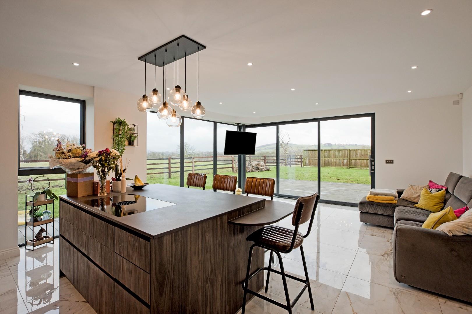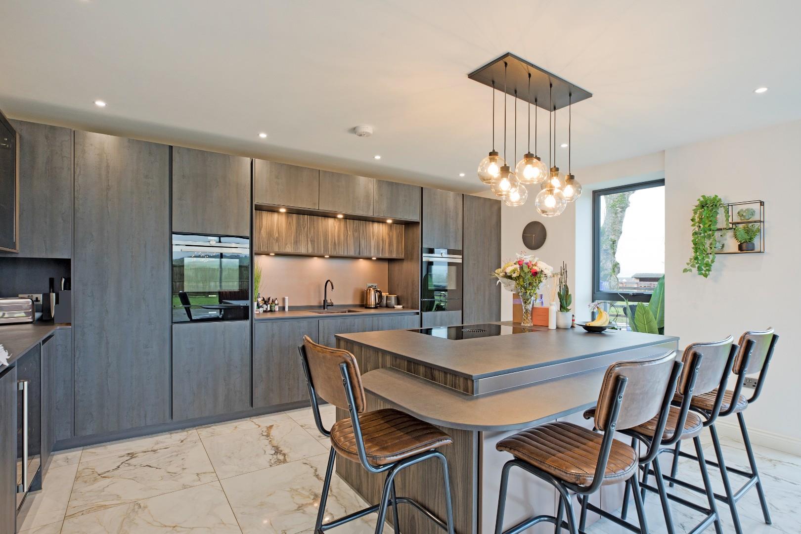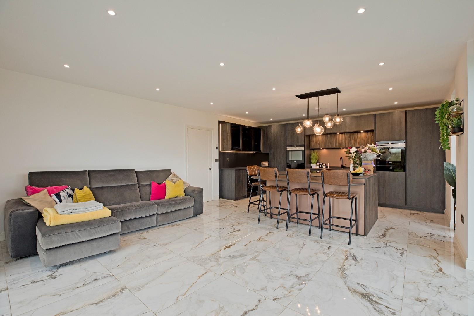 An impressive, light and airy, beautifully presented living dining kitchen, where ones eyes are immediately drawn to the fantastic, long distance views through tall, double glazed windows and sliding doors leading out to the decking in the garden. The kitchen is fitted with a range of beautiful dark cabinetry with granite worksurfaces and upstands and a full range of integrated appliances including two, electric, Siemens ovens with warming plates, dishwasher, wine fridge, fridge and freezer and central island unit with pendant light fitting housing an induction hob with central, recessed extractor and providing seating for up to five people. Bronze coloured, inset sink with black mixer tap. There is ample room for comfortable furniture making this a most sociable space. Large, marble floor tiles with underfloor heating, recessed spotlights.
