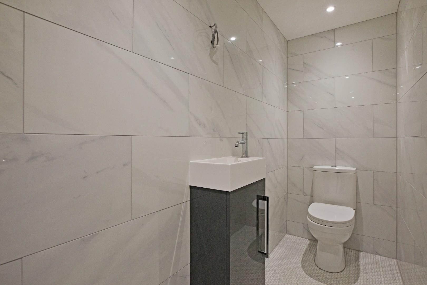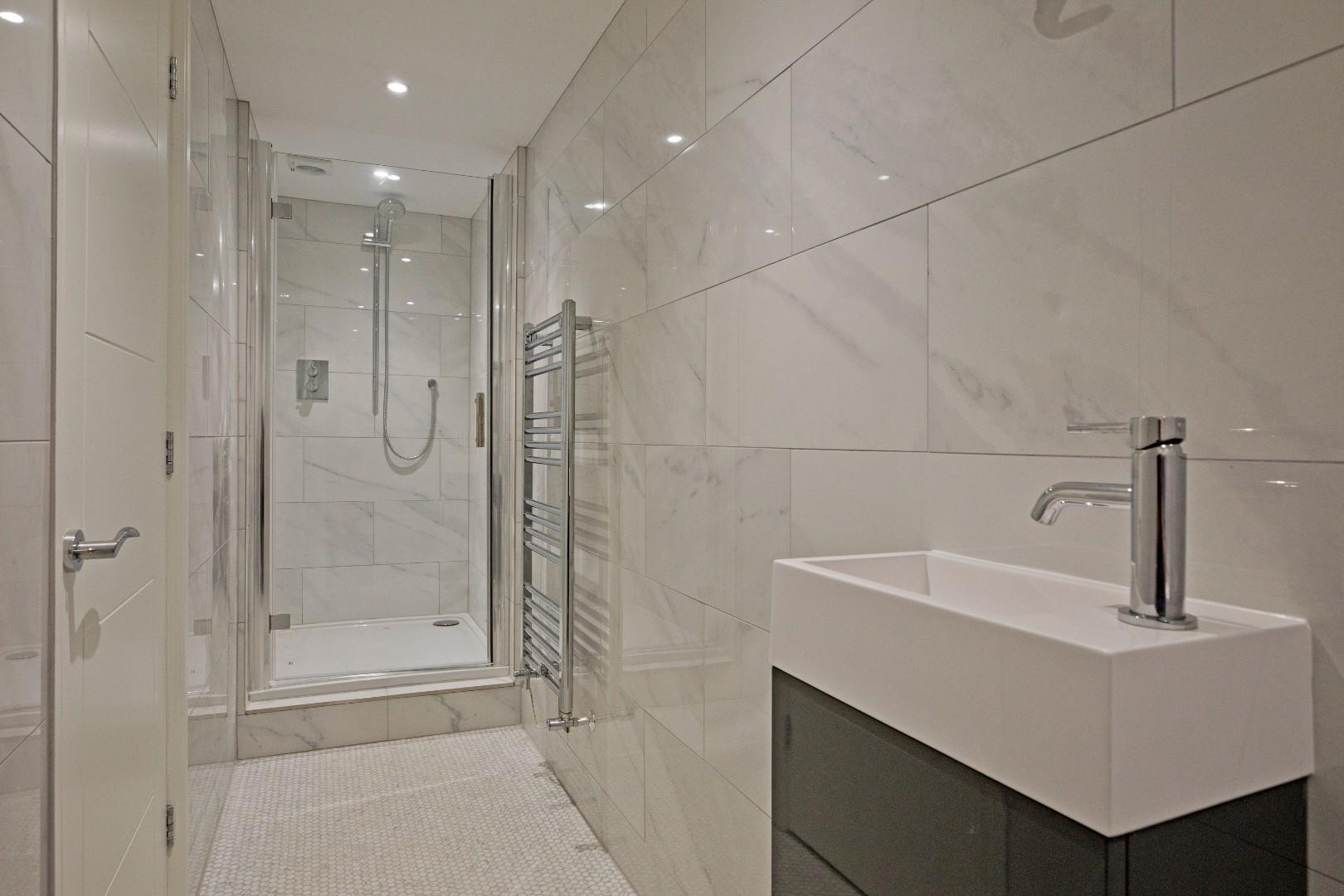 A long shower room with low-level W.C., small handbasin with chrome mixer tap set in a high gloss vanity unit and shower cubicle with glazed door and attractive, marble effect wall tiling. Complementary floor tiling with underfloor heating, recessed spotlights, extractor. Chrome, ladder style heated, towel rail.