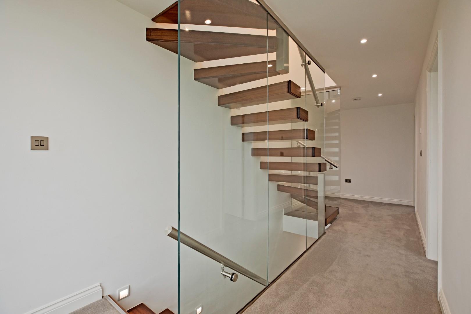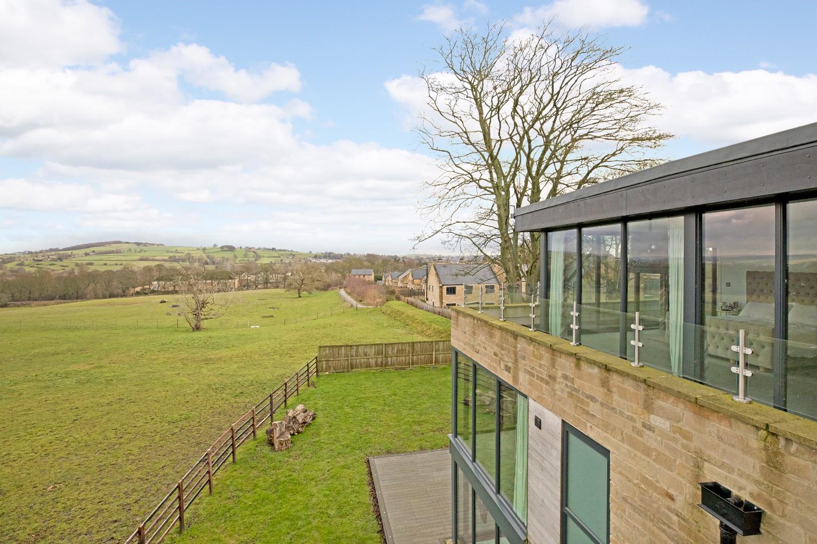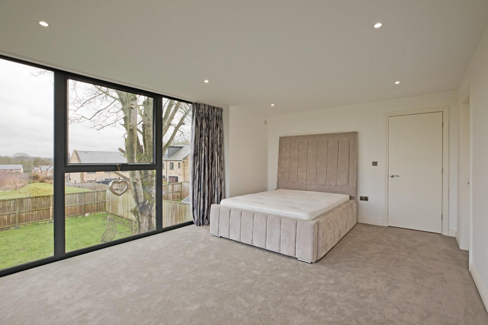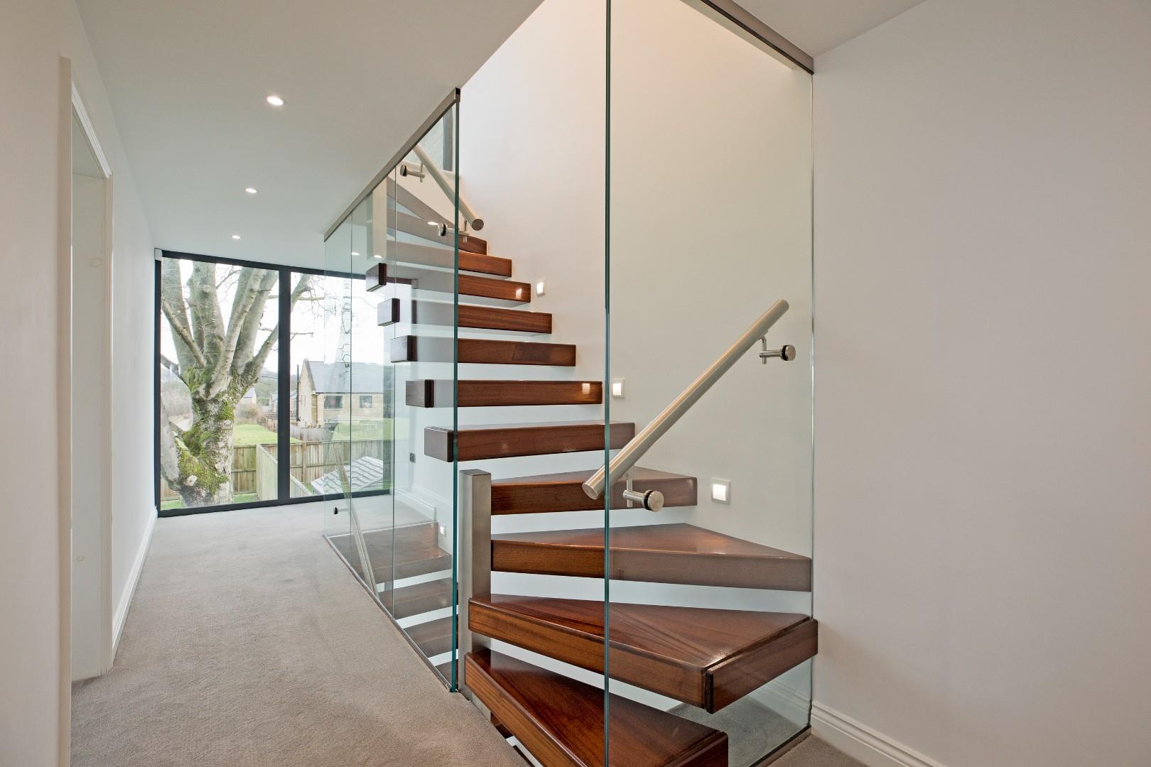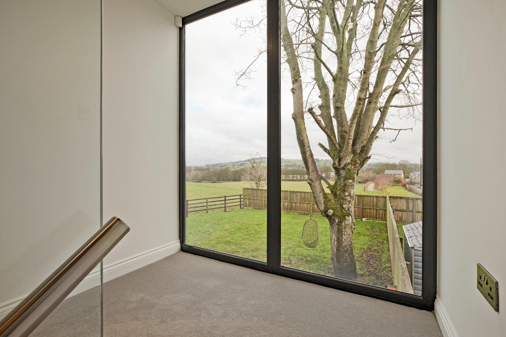 Solid timber, open tread stairs with attractive glass balustrading and stainless steel handrail lead to the first floor of the property. The landing is very spacious with carpeted flooring, radiator and recessed spotlights. Tall, double glazed windows enjoy a delightful aspect over the garden and across open fields to the Chevin in the distance. A further wooden, open tread staircase leads to the second floor.