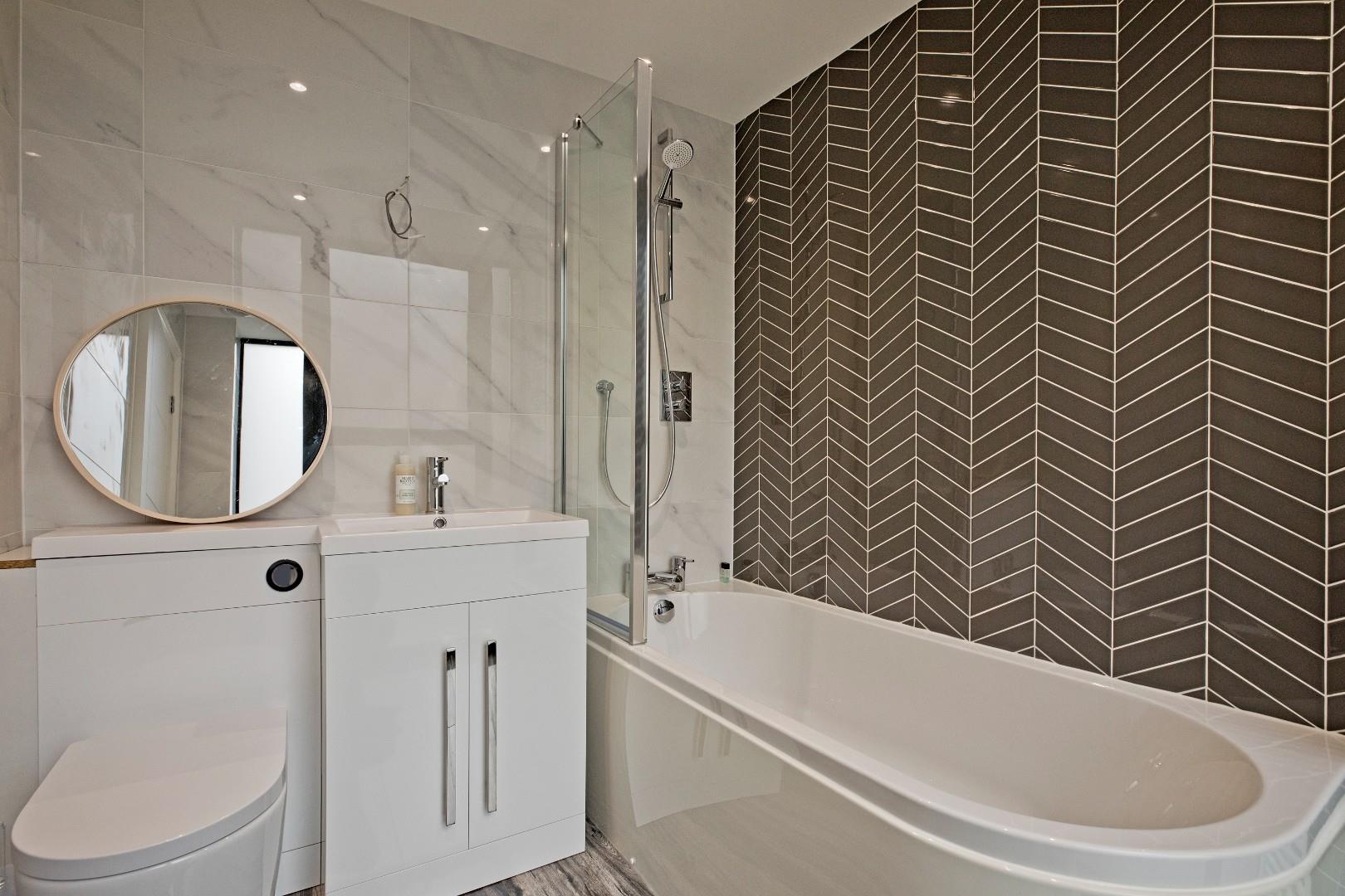 Immaculately presented with low-level W.C. with concealed cistern, inset sink with chrome mixer tap set in a white, high gloss vanity cupboard and panel bath with thermostatic shower, central, chrome mixer tap and glazed screen. Attractive, herringbone style tiling to one wall, complementary wall tiling and wood effect, gloss tiles to floor. Tall, obscure glazed window, white, ladder style, heated towel rail recessed spotlights, extractor.