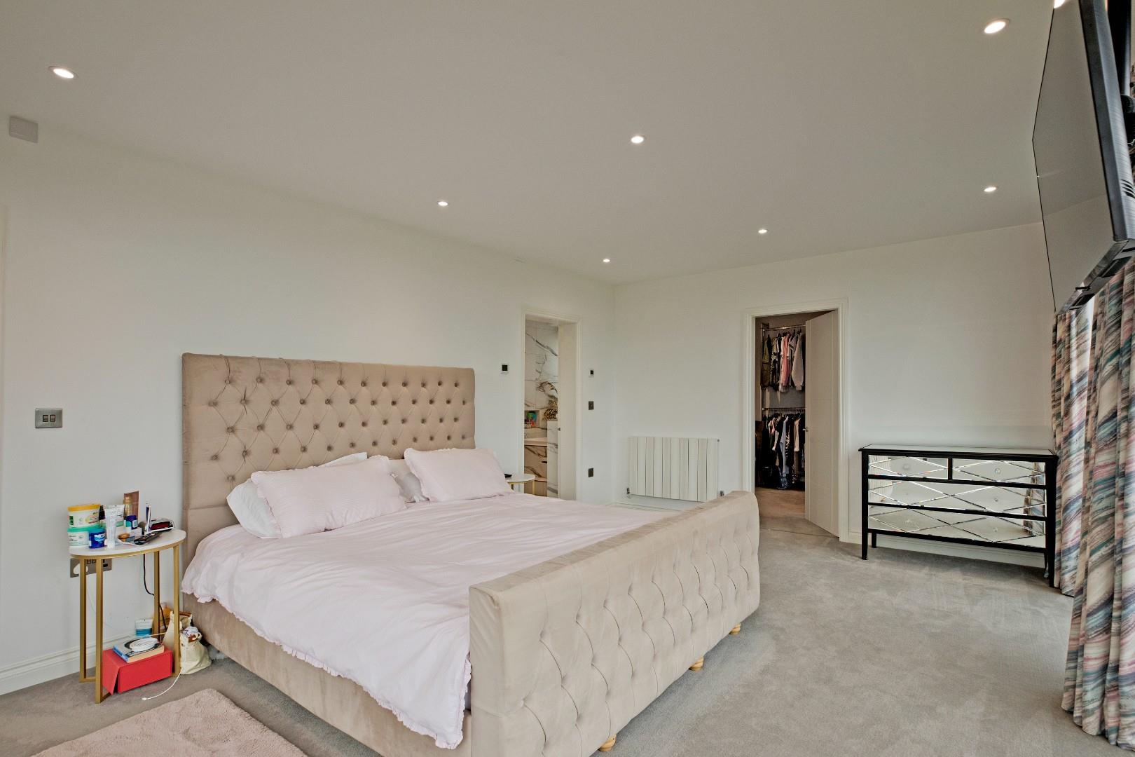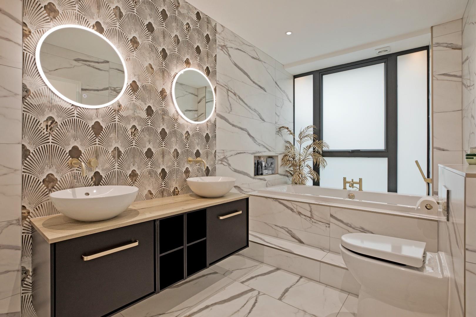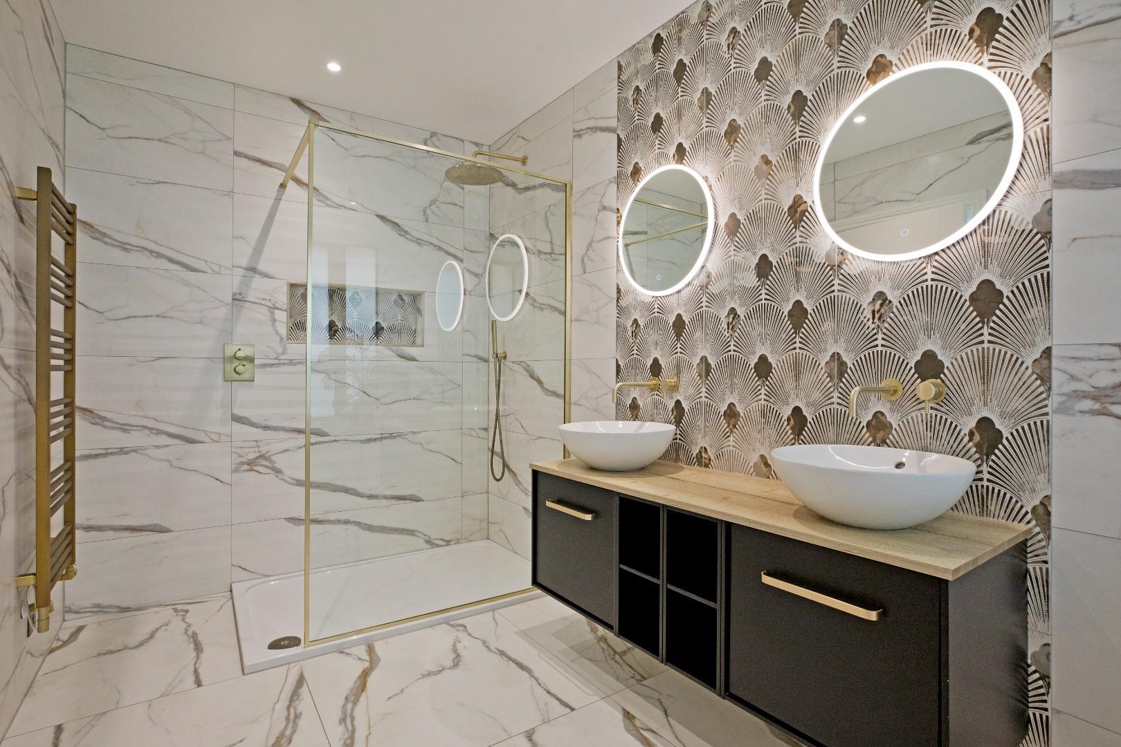 a stunning four piece, five piece ensuite bathroom with low-level WC with concealed system his and her circular hand basins with gold wall mounted taps set in a bespoke vanity unit with beautiful wall tiling and LED mirrors and deep fill bath setting a tile surround with gold central mixer tap and retractable shower attachment. Large separate walking shower with gold drench shower and additional shower attachment recessed shelf and beautiful wall and floor tiling with underfloor heating. Brushed gold heated towel rail recessed spotlights extractor. Tall obscure double glazed windows.