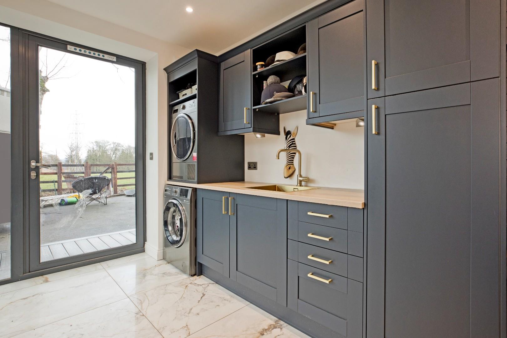 A large boot room/utility room with beautiful, Shaker style fitted cabinetry and drawers with an inset gold coloured sink with gold mixer tap and space and plumbing for a washing machine and tumble dryer. Tall, double glazed windows and door giving access to the driveway. Recessed spotlights, extractor, fitted bench and hanging for coats. Cupboard housing the gas central heating boiler. Door into: