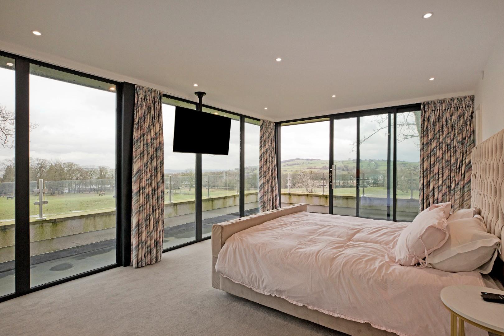 A dark wood, open tread staircase with low-level lighting and glass balustrading with stainless steel handrail leads to the second floor landing of the property, where tall, double glazed windows enjoy a fantastic open countryside outlook. Doors open into a most useful laundry cupboard with shelving and a fantastic double bedroom with dressing room and ensuite.